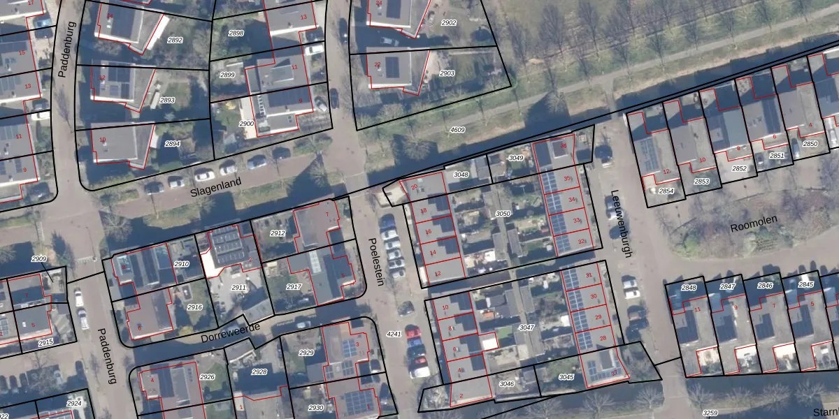 Het perceel waarop Poelestein 18 staat heeft een oppervlakte van 910 m². Dit is een groot perceel. De perceeloppervlakte wordt geregistreerd door het Kadaster. Gedetailleerde informatie over de maten van dit perceel kunt u vinden in het rapport Kadastrale kaart met maatvoering van Poelestein 18.