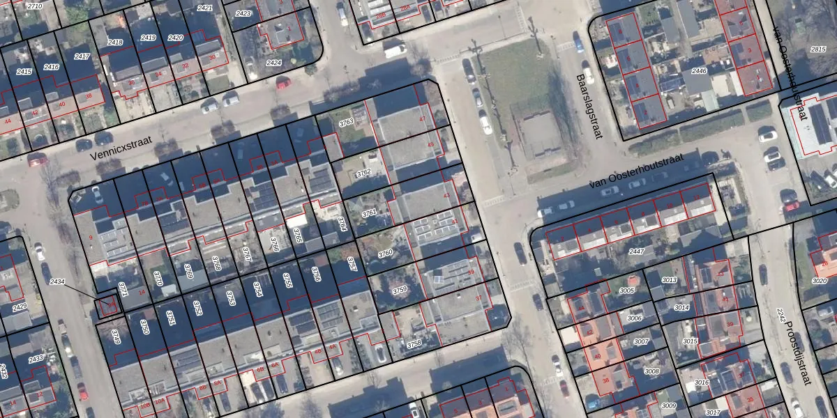 Gebruik de zoekbalk of klik op een perceel voor informatie over de adressen binnen dit perceel.