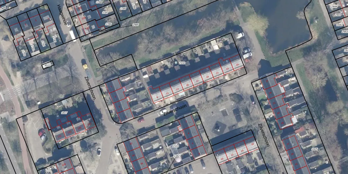 Het perceel waarop Zilverschoon 13 staat heeft een oppervlakte van 2047 m². Dit is een zeer groot perceel. De perceeloppervlakte wordt geregistreerd door het Kadaster. Gedetailleerde informatie over de maten van dit perceel kunt u vinden in het rapport Kadastrale kaart met maatvoering van Zilverschoon 13.