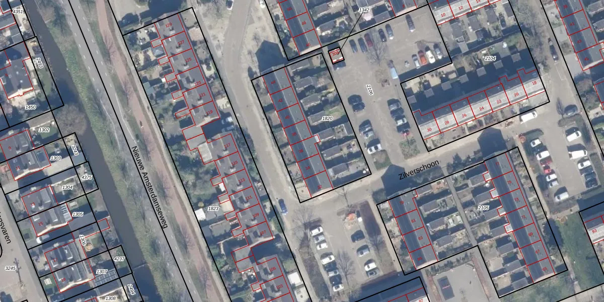 Het perceel waarop Zilverschoon 36 staat heeft een oppervlakte van 1094 m². Dit is een zeer groot perceel. De perceeloppervlakte wordt geregistreerd door het Kadaster. Gedetailleerde informatie over de maten van dit perceel kunt u vinden in het rapport Kadastrale kaart met maatvoering van Zilverschoon 36.
