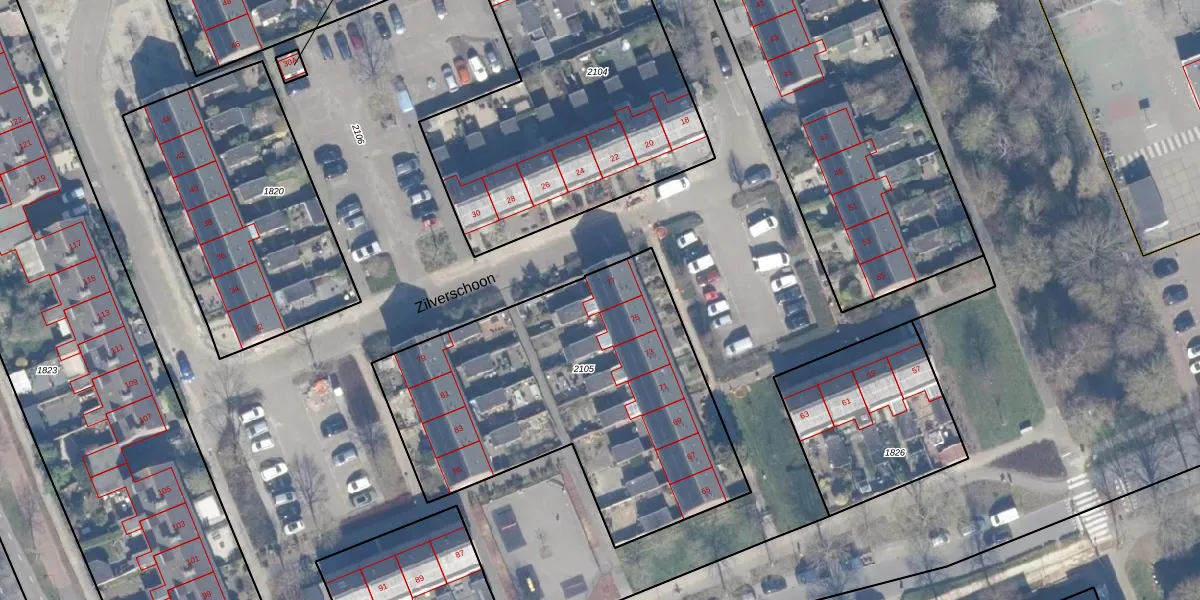 Het perceel waarop Zilverschoon 77 staat heeft een oppervlakte van 1708 m². Dit is een zeer groot perceel. De perceeloppervlakte wordt geregistreerd door het Kadaster. Gedetailleerde informatie over de maten van dit perceel kunt u vinden in het rapport Kadastrale kaart met maatvoering van Zilverschoon 77.