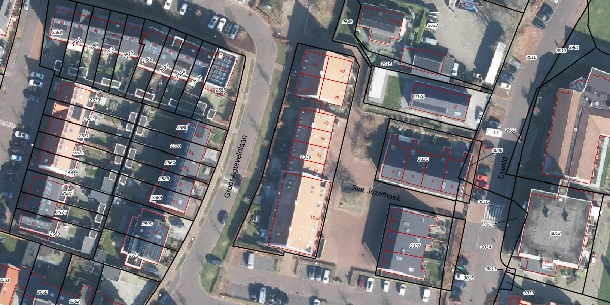Het perceel waarop Sint Jozefhoek 32 staat heeft een oppervlakte van 1590 m². Dit is een zeer groot perceel. De perceeloppervlakte wordt geregistreerd door het Kadaster. Gedetailleerde informatie over de maten van dit perceel kunt u vinden in het rapport Kadastrale kaart met maatvoering van Sint Jozefhoek 32.