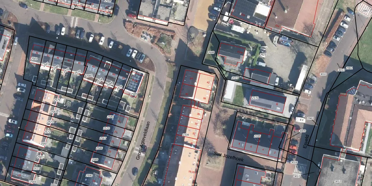Het perceel waarop Sint Jozefhoek 40 staat heeft een oppervlakte van 1590 m². Dit is een zeer groot perceel. De perceeloppervlakte wordt geregistreerd door het Kadaster. Gedetailleerde informatie over de maten van dit perceel kunt u vinden in het rapport Kadastrale kaart met maatvoering van Sint Jozefhoek 40.
