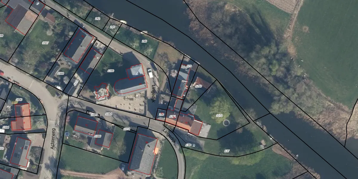 Het perceel waarop Lingedijk 91 staat heeft een oppervlakte van 187 m². Dit is een middelgroot perceel. De perceeloppervlakte wordt geregistreerd door het Kadaster. Gedetailleerde informatie over de maten van dit perceel kunt u vinden in het rapport Kadastrale kaart met maatvoering van Lingedijk 91.