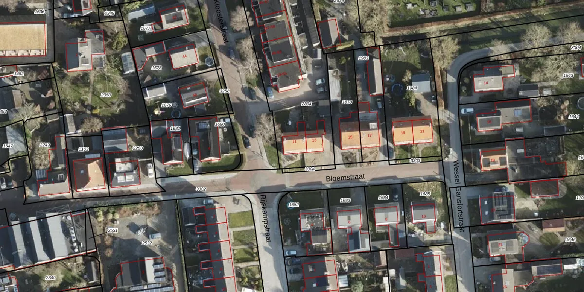 Het perceel waarop Bloemstraat 11 staat heeft een oppervlakte van 1595 m². Dit is een zeer groot perceel. De perceeloppervlakte wordt geregistreerd door het Kadaster. Gedetailleerde informatie over de maten van dit perceel kunt u vinden in het rapport Kadastrale kaart met maatvoering van Bloemstraat 11.