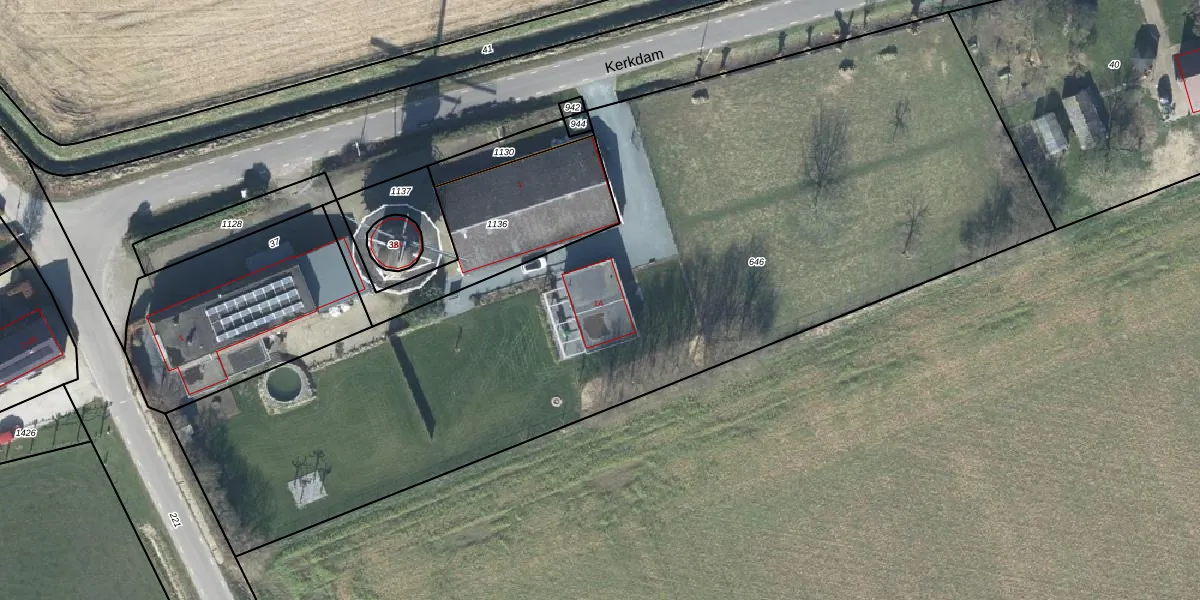 Het perceel waarop Kerkdam 1-A staat heeft een oppervlakte van 5050 m². Dit is een zeer groot perceel. De perceeloppervlakte wordt geregistreerd door het Kadaster. Gedetailleerde informatie over de maten van dit perceel kunt u vinden in het rapport Kadastrale kaart met maatvoering van Kerkdam 1-A.