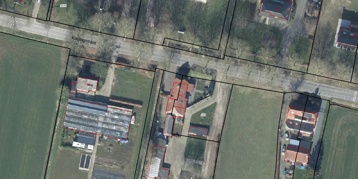 Koningstraat 110 is gelegen op kadastraal perceel DTN03D102. Deze kadastrale aanduiding is uniek en wordt gebruikt door het Kadaster om eigendomsrechten en andere zakelijke rechten vast te leggen. Het perceel maakt onderdeel uit van de kadastrale gemeente Druten.