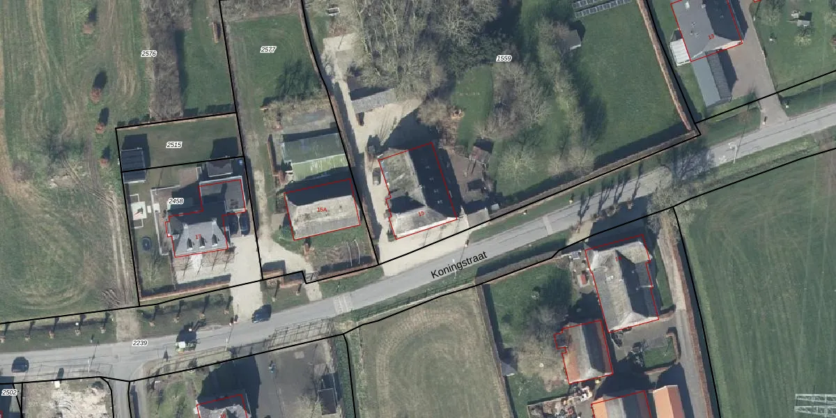 Koningstraat 15 is gelegen op kadastraal perceel DTN03D1559. Deze kadastrale aanduiding is uniek en wordt gebruikt door het Kadaster om eigendomsrechten en andere zakelijke rechten vast te leggen. Het perceel maakt onderdeel uit van de kadastrale gemeente Druten.
