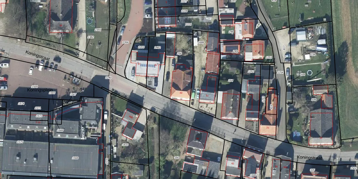 Het perceel waarop Koningstraat 33 staat heeft een oppervlakte van 590 m². Dit is een groot perceel. De perceeloppervlakte wordt geregistreerd door het Kadaster. Gedetailleerde informatie over de maten van dit perceel kunt u vinden in het rapport Kadastrale kaart met maatvoering van Koningstraat 33.