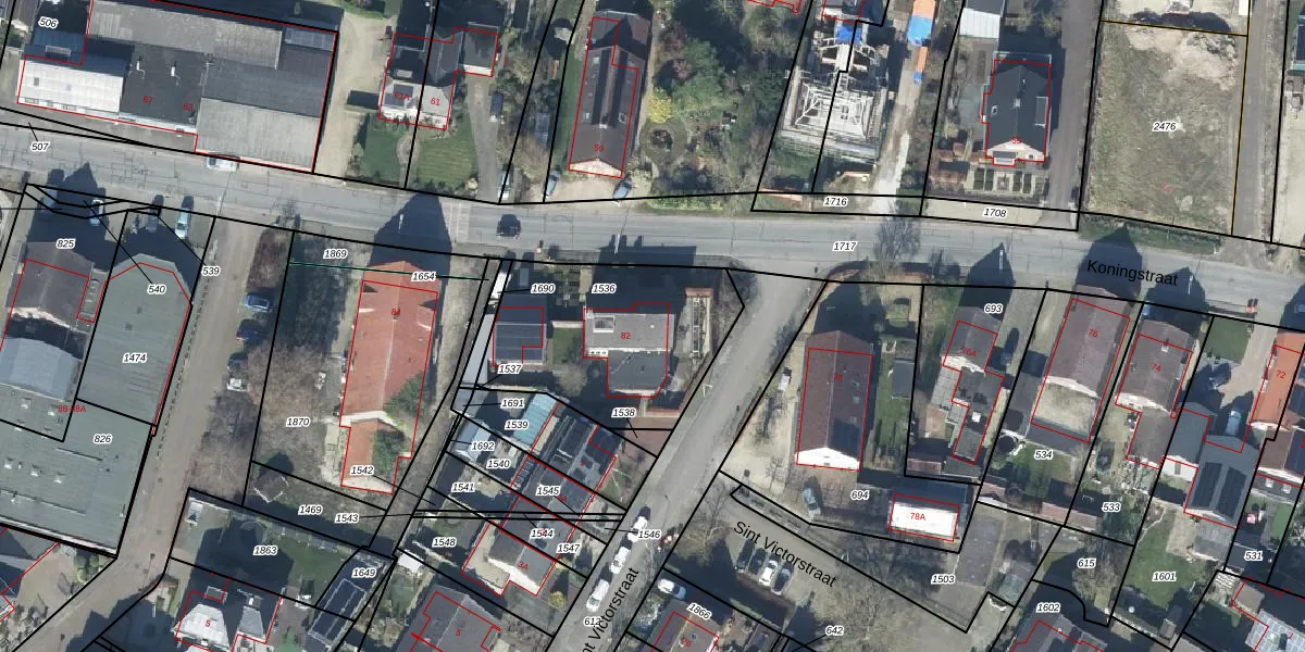 Het perceel waarop Koningstraat 82-A staat heeft een oppervlakte van 792 m². Dit is een groot perceel. De perceeloppervlakte wordt geregistreerd door het Kadaster. Gedetailleerde informatie over de maten van dit perceel kunt u vinden in het rapport Kadastrale kaart met maatvoering van Koningstraat 82-A.