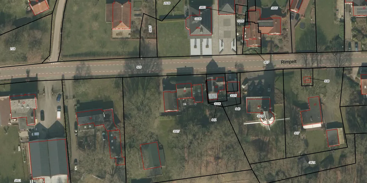 Het perceel waarop Rimpelt 16 staat heeft een oppervlakte van 3123 m². Dit is een zeer groot perceel. De perceeloppervlakte wordt geregistreerd door het Kadaster. Gedetailleerde informatie over de maten van dit perceel kunt u vinden in het rapport Kadastrale kaart met maatvoering van Rimpelt 16.