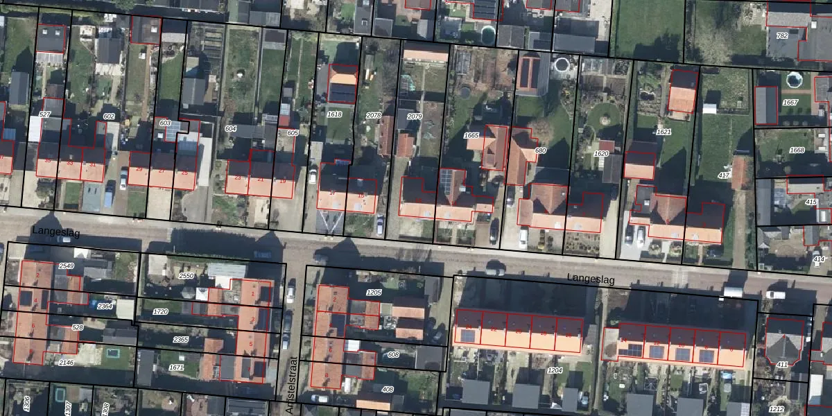 Het perceel waarop Langeslag 13 staat heeft een oppervlakte van 562 m². Dit is een groot perceel. De perceeloppervlakte wordt geregistreerd door het Kadaster. Gedetailleerde informatie over de maten van dit perceel kunt u vinden in het rapport Kadastrale kaart met maatvoering van Langeslag 13.