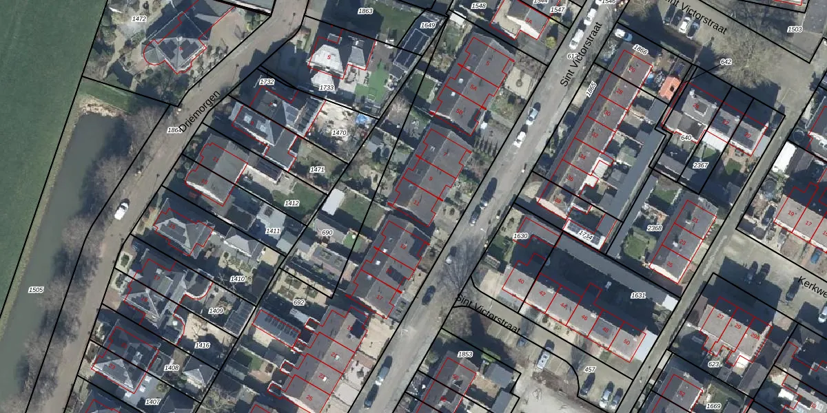 Het perceel waarop Sint Victorstraat 11 staat heeft een oppervlakte van 3380 m². Dit is een zeer groot perceel. De perceeloppervlakte wordt geregistreerd door het Kadaster. Gedetailleerde informatie over de maten van dit perceel kunt u vinden in het rapport Kadastrale kaart met maatvoering van Sint Victorstraat 11.