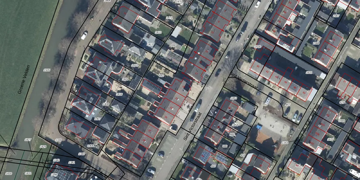 Het perceel waarop Sint Victorstraat 19 staat heeft een oppervlakte van 3380 m². Dit is een zeer groot perceel. De perceeloppervlakte wordt geregistreerd door het Kadaster. Gedetailleerde informatie over de maten van dit perceel kunt u vinden in het rapport Kadastrale kaart met maatvoering van Sint Victorstraat 19.
