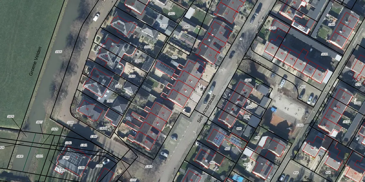 Het perceel waarop Sint Victorstraat 23 staat heeft een oppervlakte van 3380 m². Dit is een zeer groot perceel. De perceeloppervlakte wordt geregistreerd door het Kadaster. Gedetailleerde informatie over de maten van dit perceel kunt u vinden in het rapport Kadastrale kaart met maatvoering van Sint Victorstraat 23.