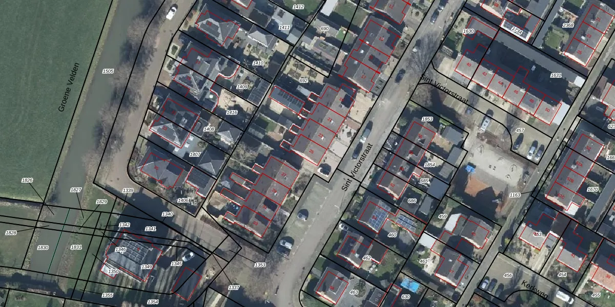 Het perceel waarop Sint Victorstraat 25 staat heeft een oppervlakte van 3380 m². Dit is een zeer groot perceel. De perceeloppervlakte wordt geregistreerd door het Kadaster. Gedetailleerde informatie over de maten van dit perceel kunt u vinden in het rapport Kadastrale kaart met maatvoering van Sint Victorstraat 25.