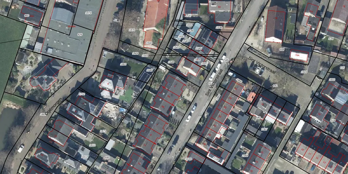 Het perceel waarop Sint Victorstraat 5 staat heeft een oppervlakte van 3380 m². Dit is een zeer groot perceel. De perceeloppervlakte wordt geregistreerd door het Kadaster. Gedetailleerde informatie over de maten van dit perceel kunt u vinden in het rapport Kadastrale kaart met maatvoering van Sint Victorstraat 5.