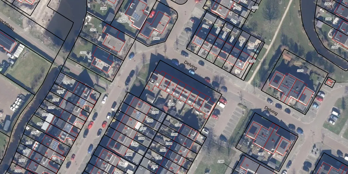 Het perceel waarop Delving 23 staat heeft een oppervlakte van 1010 m². Dit is een zeer groot perceel. De perceeloppervlakte wordt geregistreerd door het Kadaster. Gedetailleerde informatie over de maten van dit perceel kunt u vinden in het rapport Kadastrale kaart met maatvoering van Delving 23.
