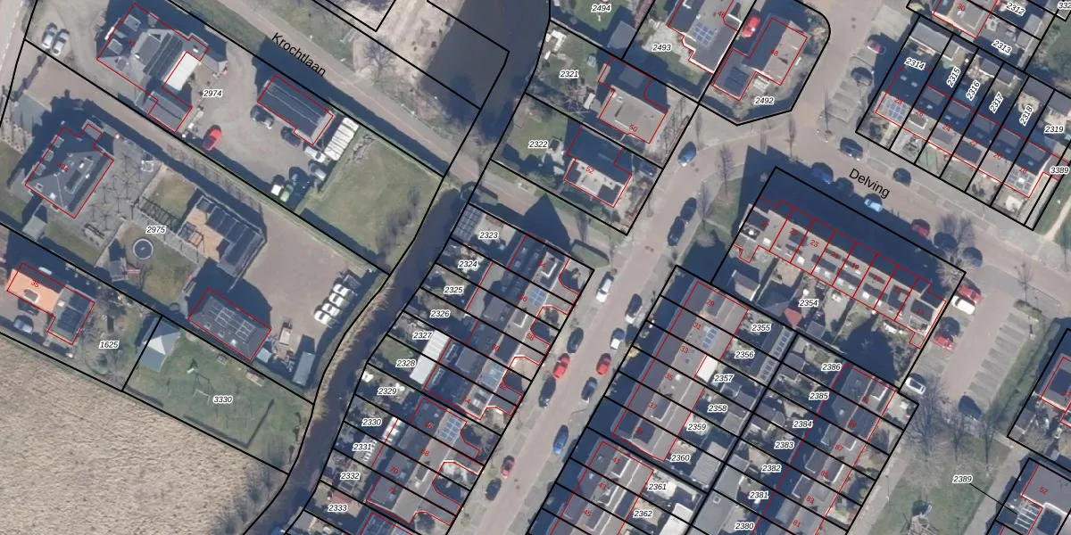 Het perceel waarop Delving 54 staat heeft een oppervlakte van 203 m². Dit is een middelgroot perceel. De perceeloppervlakte wordt geregistreerd door het Kadaster. Gedetailleerde informatie over de maten van dit perceel kunt u vinden in het rapport Kadastrale kaart met maatvoering van Delving 54.