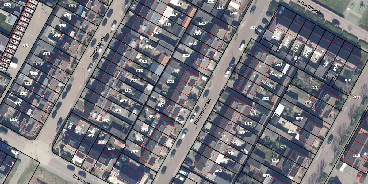 Het perceel waarop Schubertstraat 12 staat heeft een oppervlakte van 495 m². Dit is een groot perceel. De perceeloppervlakte wordt geregistreerd door het Kadaster. Gedetailleerde informatie over de maten van dit perceel kunt u vinden in het rapport Kadastrale kaart met maatvoering van Schubertstraat 12.