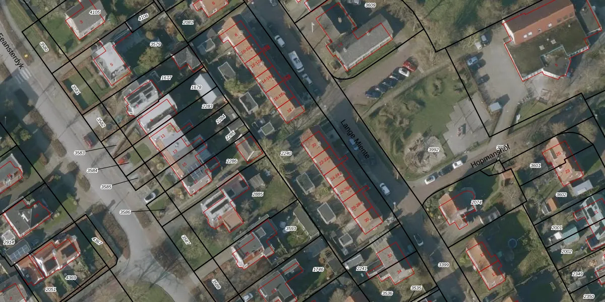 Het perceel waarop Lange Miente 22 staat heeft een oppervlakte van 2060 m². Dit is een zeer groot perceel. De perceeloppervlakte wordt geregistreerd door het Kadaster. Gedetailleerde informatie over de maten van dit perceel kunt u vinden in het rapport Kadastrale kaart met maatvoering van Lange Miente 22.