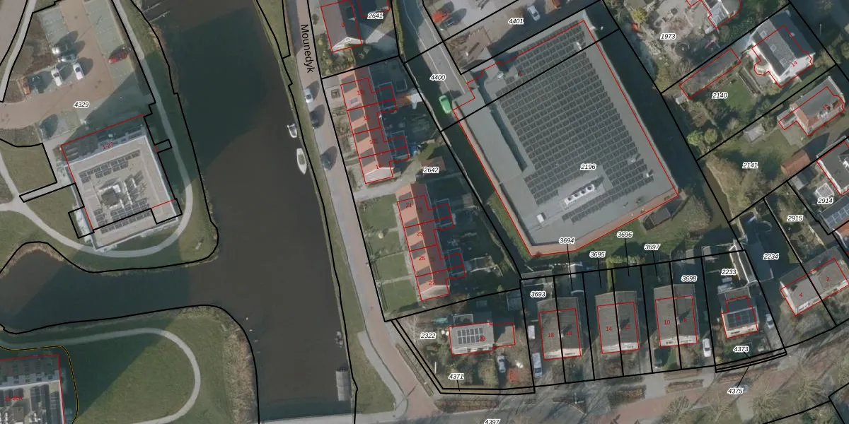 Het perceel waarop Mounedyk 21 staat heeft een oppervlakte van 1580 m². Dit is een zeer groot perceel. De perceeloppervlakte wordt geregistreerd door het Kadaster. Gedetailleerde informatie over de maten van dit perceel kunt u vinden in het rapport Kadastrale kaart met maatvoering van Mounedyk 21.