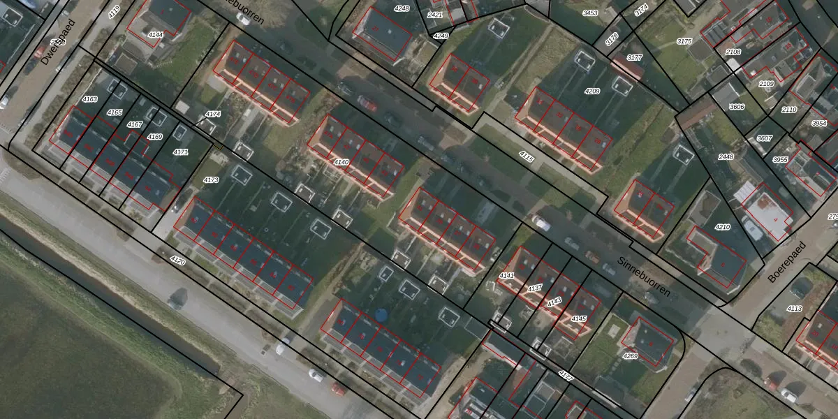 Het perceel waarop Sinnebuorren 41 staat heeft een oppervlakte van 2129 m². Dit is een zeer groot perceel. De perceeloppervlakte wordt geregistreerd door het Kadaster. Gedetailleerde informatie over de maten van dit perceel kunt u vinden in het rapport Kadastrale kaart met maatvoering van Sinnebuorren 41.