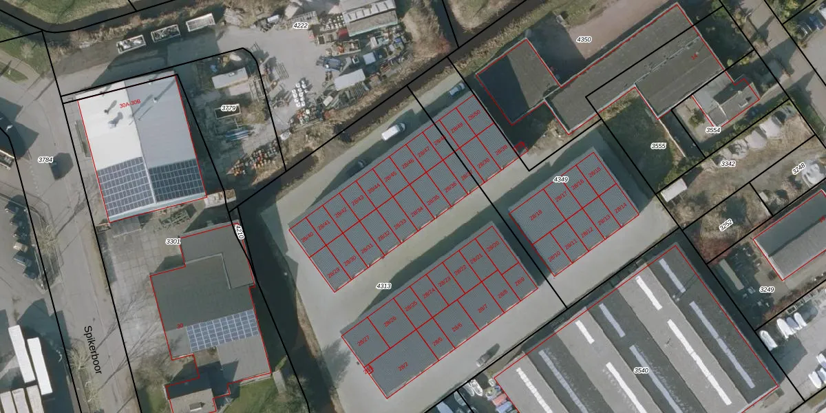 Het perceel waarop Spikerboor 28-34 staat heeft een oppervlakte van 4903 m². Dit is een zeer groot perceel. De perceeloppervlakte wordt geregistreerd door het Kadaster. Gedetailleerde informatie over de maten van dit perceel kunt u vinden in het rapport Kadastrale kaart met maatvoering van Spikerboor 28-34.