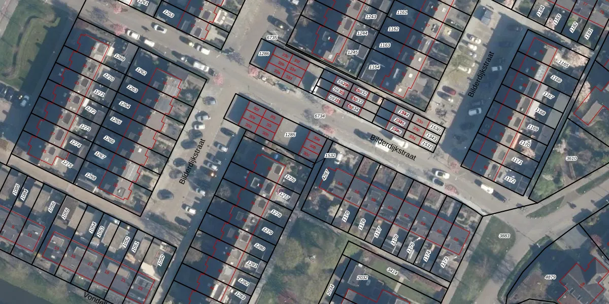 Het perceel waarop Bilderdijkstraat 30-c staat heeft een oppervlakte van 303 m². Dit is een groot perceel. De perceeloppervlakte wordt geregistreerd door het Kadaster. Gedetailleerde informatie over de maten van dit perceel kunt u vinden in het rapport Kadastrale kaart met maatvoering van Bilderdijkstraat 30-c.
