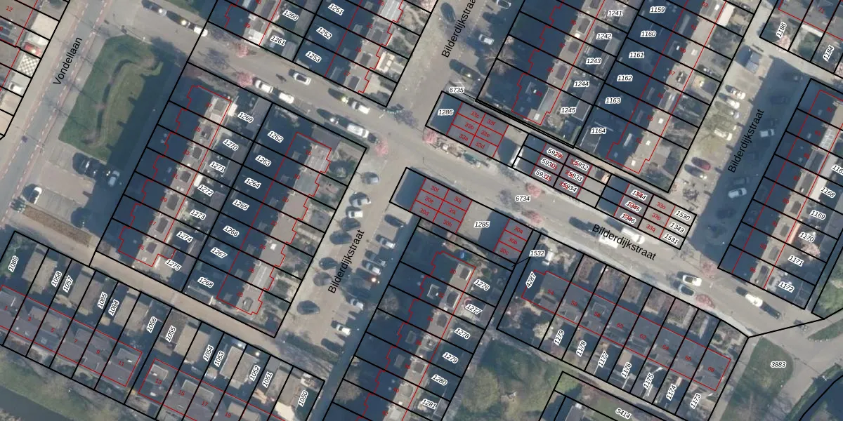 Het perceel waarop Bilderdijkstraat 30-d staat heeft een oppervlakte van 303 m². Dit is een groot perceel. De perceeloppervlakte wordt geregistreerd door het Kadaster. Gedetailleerde informatie over de maten van dit perceel kunt u vinden in het rapport Kadastrale kaart met maatvoering van Bilderdijkstraat 30-d.