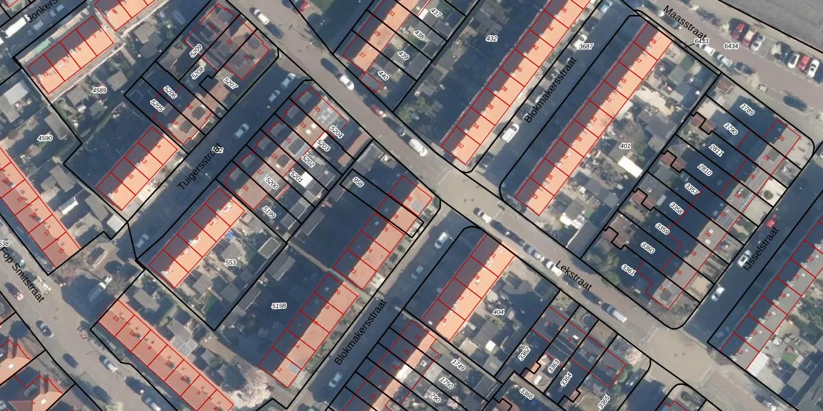Het perceel waarop Blokmakersstraat 30 staat heeft een oppervlakte van 2275 m². Dit is een zeer groot perceel. De perceeloppervlakte wordt geregistreerd door het Kadaster. Gedetailleerde informatie over de maten van dit perceel kunt u vinden in het rapport Kadastrale kaart met maatvoering van Blokmakersstraat 30.