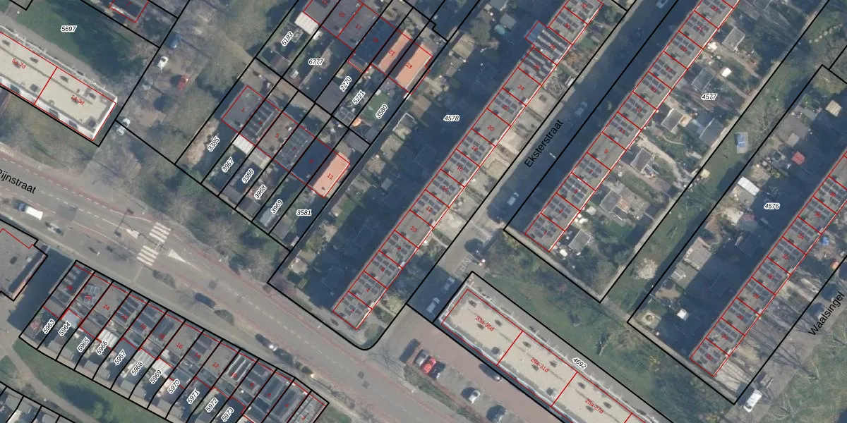 Het perceel waarop Eksterstraat 12 staat heeft een oppervlakte van 3010 m². Dit is een zeer groot perceel. De perceeloppervlakte wordt geregistreerd door het Kadaster. Gedetailleerde informatie over de maten van dit perceel kunt u vinden in het rapport Kadastrale kaart met maatvoering van Eksterstraat 12.