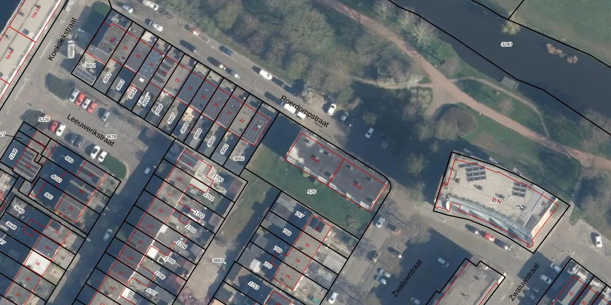 Het perceel waarop Roerdompstraat 8-b staat heeft een oppervlakte van 963 m². Dit is een groot perceel. De perceeloppervlakte wordt geregistreerd door het Kadaster. Gedetailleerde informatie over de maten van dit perceel kunt u vinden in het rapport Kadastrale kaart met maatvoering van Roerdompstraat 8-b.