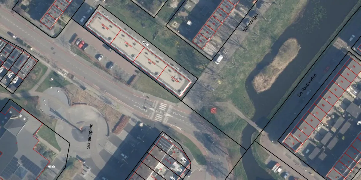 Het perceel waarop Scheldeplein 21-d staat heeft een oppervlakte van 1045 m². Dit is een zeer groot perceel. De perceeloppervlakte wordt geregistreerd door het Kadaster. Gedetailleerde informatie over de maten van dit perceel kunt u vinden in het rapport Kadastrale kaart met maatvoering van Scheldeplein 21-d.