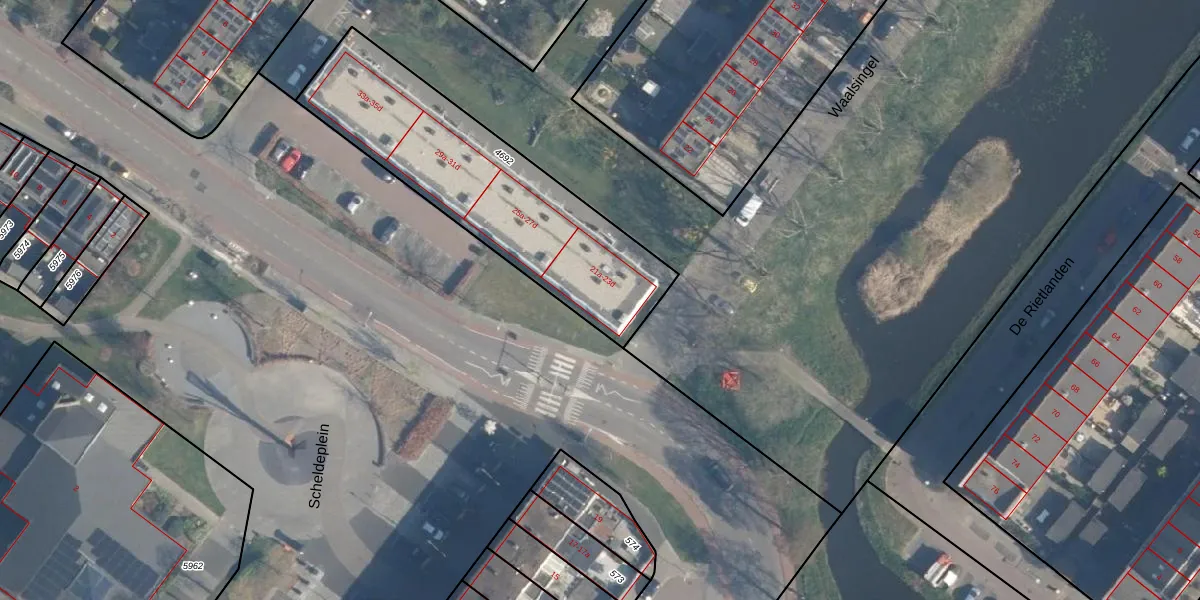 Het perceel waarop Scheldeplein 21-c staat heeft een oppervlakte van 1045 m². Dit is een zeer groot perceel. De perceeloppervlakte wordt geregistreerd door het Kadaster. Gedetailleerde informatie over de maten van dit perceel kunt u vinden in het rapport Kadastrale kaart met maatvoering van Scheldeplein 21-c.