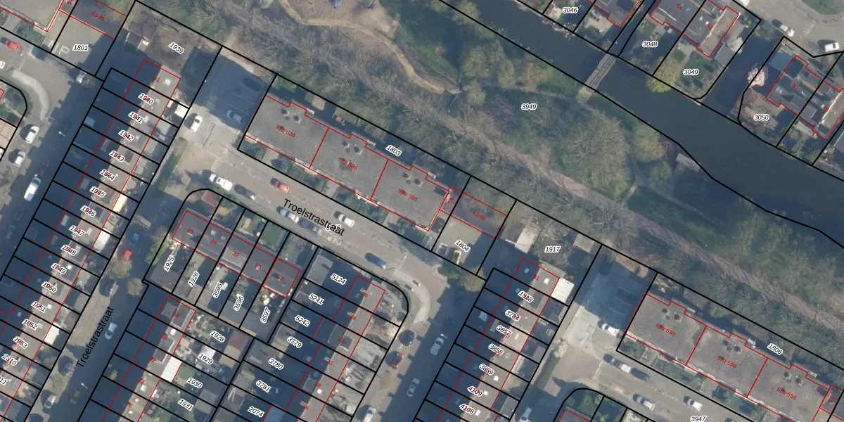 Het perceel waarop Troelstrastraat 53-a staat heeft een oppervlakte van 1067 m². Dit is een zeer groot perceel. De perceeloppervlakte wordt geregistreerd door het Kadaster. Gedetailleerde informatie over de maten van dit perceel kunt u vinden in het rapport Kadastrale kaart met maatvoering van Troelstrastraat 53-a.
