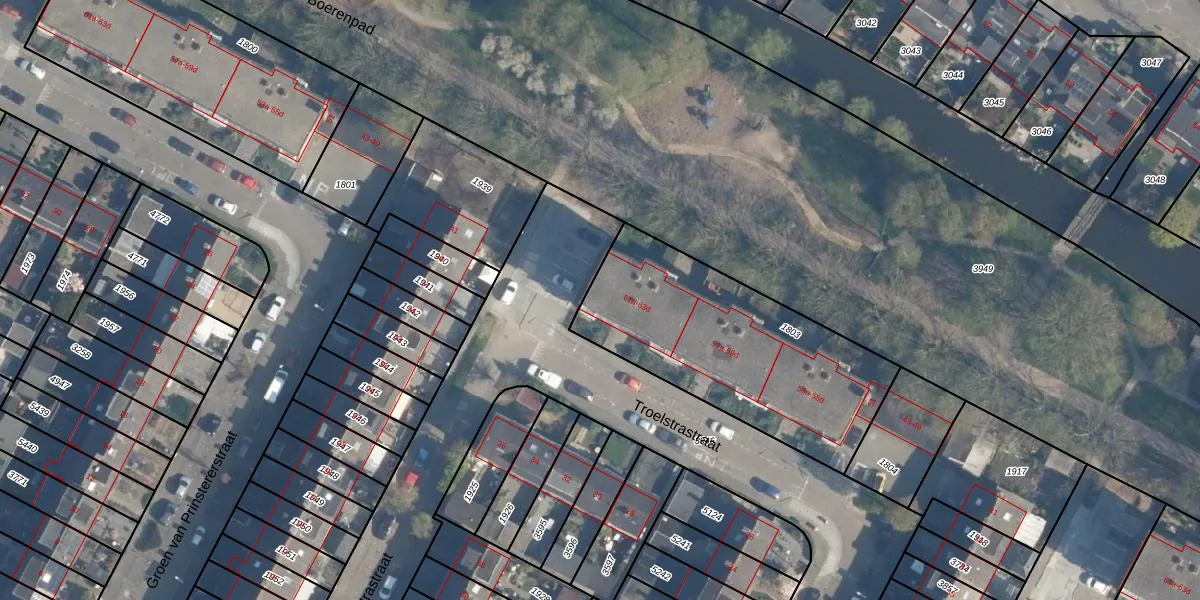 Het perceel waarop Troelstrastraat 63-d staat heeft een oppervlakte van 1067 m². Dit is een zeer groot perceel. De perceeloppervlakte wordt geregistreerd door het Kadaster. Gedetailleerde informatie over de maten van dit perceel kunt u vinden in het rapport Kadastrale kaart met maatvoering van Troelstrastraat 63-d.