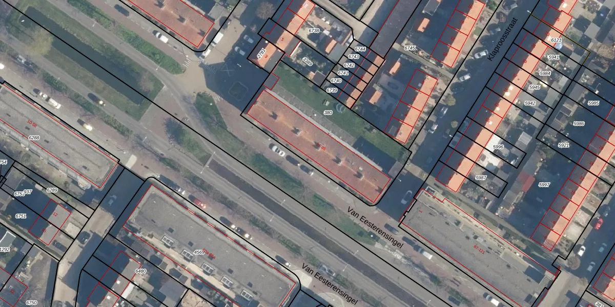 Het perceel waarop Van Eesterensingel 55 staat heeft een oppervlakte van 1175 m². Dit is een zeer groot perceel. De perceeloppervlakte wordt geregistreerd door het Kadaster. Gedetailleerde informatie over de maten van dit perceel kunt u vinden in het rapport Kadastrale kaart met maatvoering van Van Eesterensingel 55.