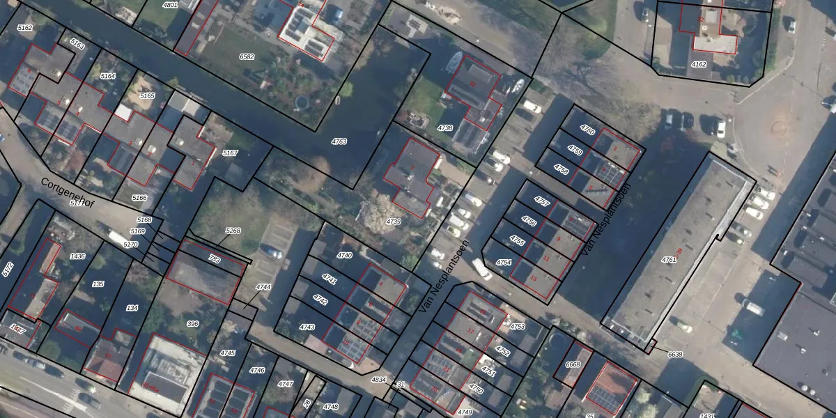 Het perceel waarop Van Nesplantsoen 2 staat heeft een oppervlakte van 870 m². Dit is een groot perceel. De perceeloppervlakte wordt geregistreerd door het Kadaster. Gedetailleerde informatie over de maten van dit perceel kunt u vinden in het rapport Kadastrale kaart met maatvoering van Van Nesplantsoen 2.