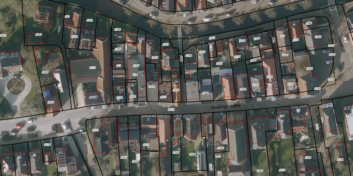 Het perceel waarop Andringastrjitte 20 staat heeft een oppervlakte van 96 m². Dit is een klein perceel. De perceeloppervlakte wordt geregistreerd door het Kadaster. Gedetailleerde informatie over de maten van dit perceel kunt u vinden in het rapport Kadastrale kaart met maatvoering van Andringastrjitte 20.
