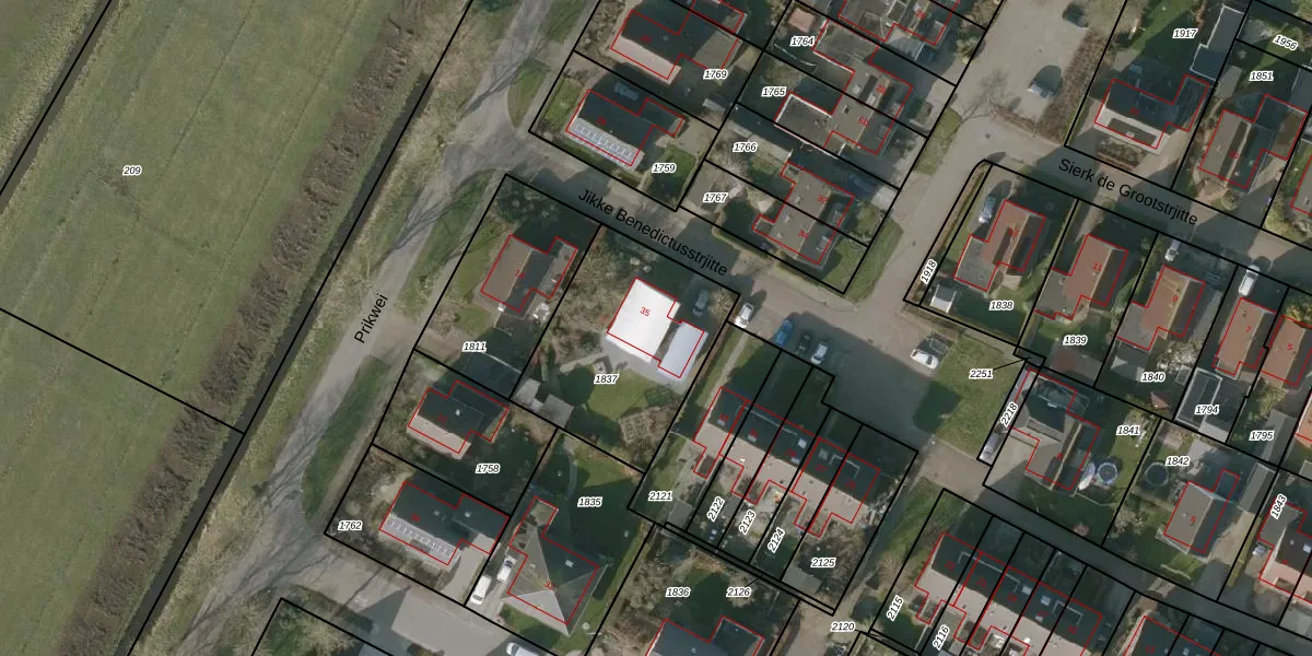 Het perceel waarop Jikke Benedictusstrjitte 35 staat heeft een oppervlakte van 727 m². Dit is een groot perceel. De perceeloppervlakte wordt geregistreerd door het Kadaster. Gedetailleerde informatie over de maten van dit perceel kunt u vinden in het rapport Kadastrale kaart met maatvoering van Jikke Benedictusstrjitte 35.