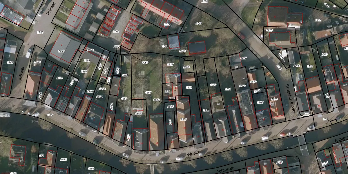 Het perceel waarop Weaze 22 staat heeft een oppervlakte van 97 m². Dit is een klein perceel. De perceeloppervlakte wordt geregistreerd door het Kadaster. Gedetailleerde informatie over de maten van dit perceel kunt u vinden in het rapport Kadastrale kaart met maatvoering van Weaze 22.