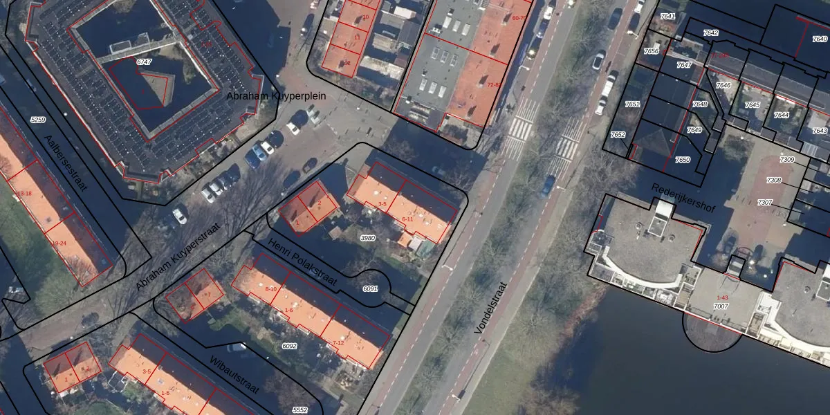 Het perceel waarop Abraham Kuyperplein 7 staat heeft een oppervlakte van 1065 m². Dit is een zeer groot perceel. De perceeloppervlakte wordt geregistreerd door het Kadaster. Gedetailleerde informatie over de maten van dit perceel kunt u vinden in het rapport Kadastrale kaart met maatvoering van Abraham Kuyperplein 7.