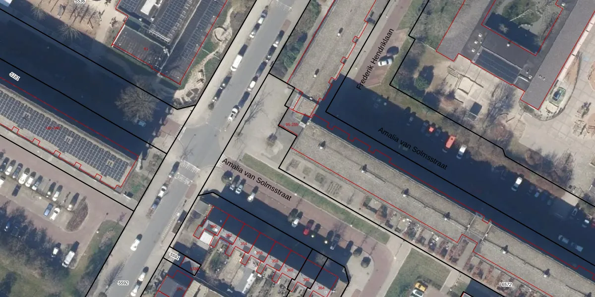 Het perceel waarop Amalia van Solmsstraat 97 staat heeft een oppervlakte van 6869 m². Dit is een zeer groot perceel. De perceeloppervlakte wordt geregistreerd door het Kadaster. Gedetailleerde informatie over de maten van dit perceel kunt u vinden in het rapport Kadastrale kaart met maatvoering van Amalia van Solmsstraat 97.