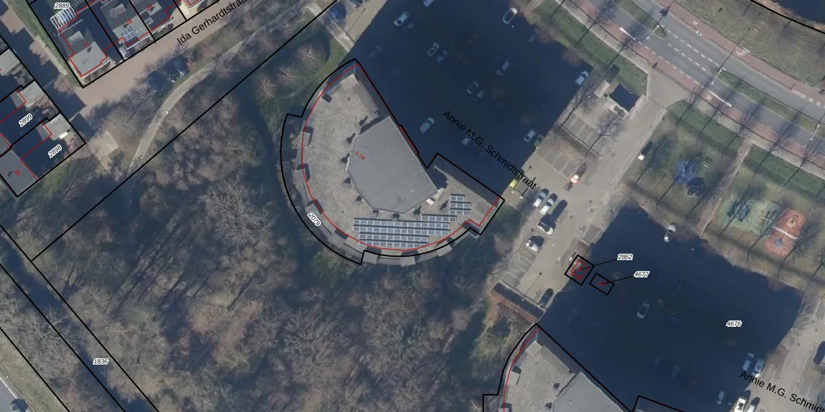 Het perceel waarop Annie M.G. Schmidtstraat 17 staat heeft een oppervlakte van 1490 m². Dit is een zeer groot perceel. De perceeloppervlakte wordt geregistreerd door het Kadaster. Gedetailleerde informatie over de maten van dit perceel kunt u vinden in het rapport Kadastrale kaart met maatvoering van Annie M.G. Schmidtstraat 17.