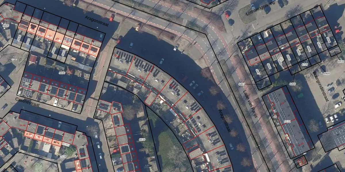 Het perceel waarop Aragonstraat 49 staat heeft een oppervlakte van 4180 m². Dit is een zeer groot perceel. De perceeloppervlakte wordt geregistreerd door het Kadaster. Gedetailleerde informatie over de maten van dit perceel kunt u vinden in het rapport Kadastrale kaart met maatvoering van Aragonstraat 49.