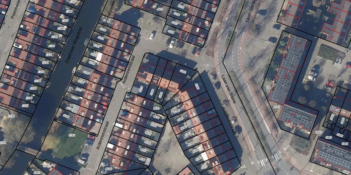 Het perceel waarop Ardennenstraat 1 staat heeft een oppervlakte van 197 m². Dit is een middelgroot perceel. De perceeloppervlakte wordt geregistreerd door het Kadaster. Gedetailleerde informatie over de maten van dit perceel kunt u vinden in het rapport Kadastrale kaart met maatvoering van Ardennenstraat 1.