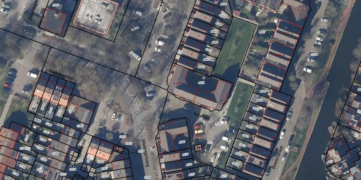 Het perceel waarop Arkplein 36 staat heeft een oppervlakte van 597 m². Dit is een groot perceel. De perceeloppervlakte wordt geregistreerd door het Kadaster. Gedetailleerde informatie over de maten van dit perceel kunt u vinden in het rapport Kadastrale kaart met maatvoering van Arkplein 36.