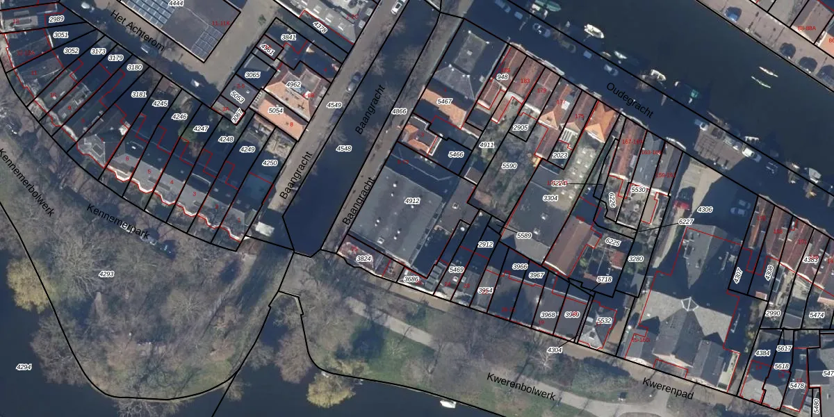 Het perceel waarop Baangracht 33 staat heeft een oppervlakte van 569 m². Dit is een groot perceel. De perceeloppervlakte wordt geregistreerd door het Kadaster. Gedetailleerde informatie over de maten van dit perceel kunt u vinden in het rapport Kadastrale kaart met maatvoering van Baangracht 33.