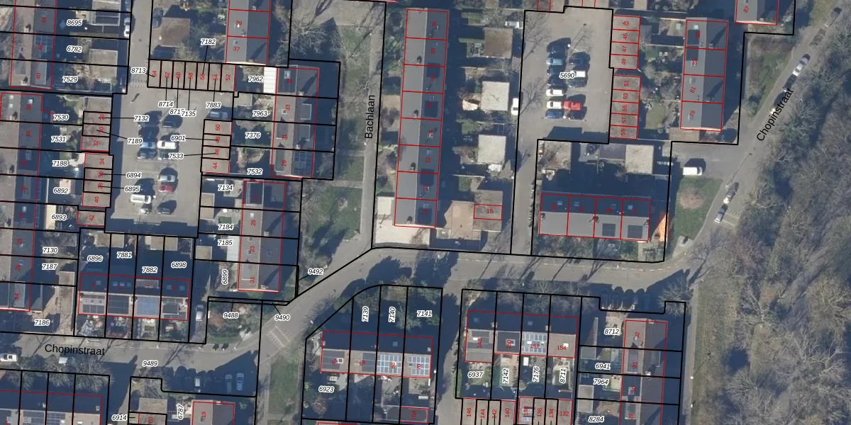 Het perceel waarop Bachlaan 18 staat heeft een oppervlakte van 6872 m². Dit is een zeer groot perceel. De perceeloppervlakte wordt geregistreerd door het Kadaster. Gedetailleerde informatie over de maten van dit perceel kunt u vinden in het rapport Kadastrale kaart met maatvoering van Bachlaan 18.